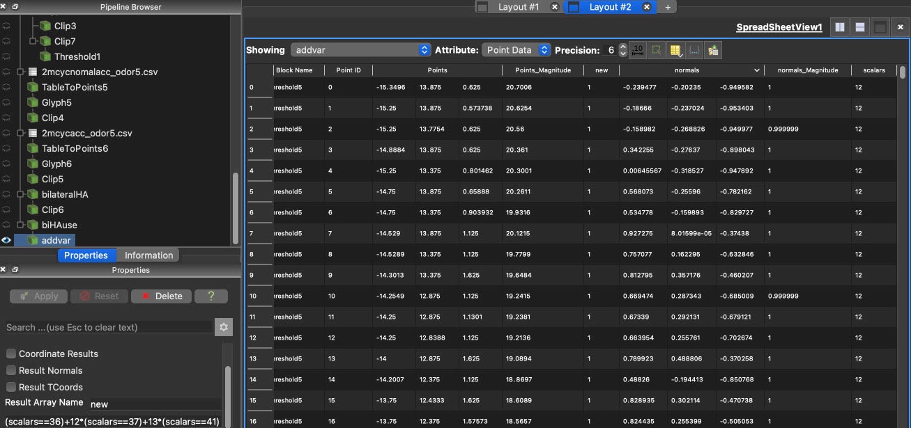 GroupDatasets: groups multiple datasets to create a single data set (without actually duplicate the heavy data)Glyph: place markers or glyphs at point locations in the input dataset.Threshold: cells that have scalars within the specified range (include the lower and upper threshold) will be passed through the filter.Clip: clip any dataset using either an implicit function (such as a plane, sphere, or a box)Calculator: computes a new data array or new point coordinates as a function of existing input arrays. The name of variable is case sensitive. Results can be seen in the spreadsheet view.